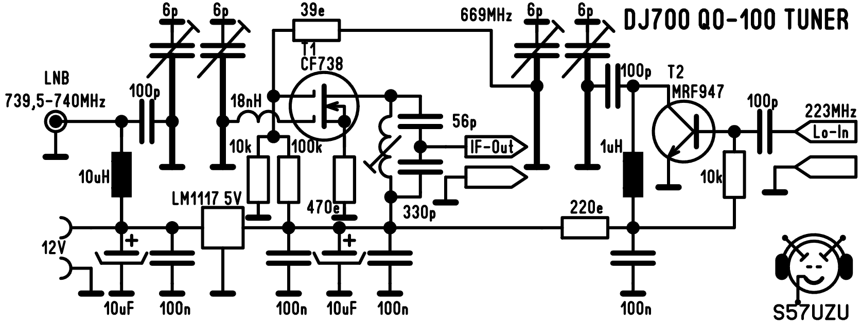 Napajanje 12 V je priključeno na vhod enosmernega toka, kjer serijska dioda, D1, ščiti pretvornik pred obratno polariteto. Napajanje poteka skozi dušilko Du2 do SMA priključka (LNB/DC12V), kjer potuje po koaksialnem kablu za napajanje LNB-a. Visokofrekvenčni izhod 739 MHz iz LNB poteka po istem koaksialnem kablu v nasprotni smeri. Du2 deluje kot visokofrekvenčna dušilka, izmenični signal pa je povezan prek C1 na 50 ohmski delilnik moči R4 R5 in R6. Delilnik oslabi izhod za 6 dB. Signal na spodnjem koncu R2 se uporabi za uporovni dušilnik R1 R2 in R3. To doda dodatnih 12 dB slabljenja signalu, ki je za izmenično napetost povezan z izhodom za SDR ključek. Tako smo pridobili na univerzalnosti tega pretvornika za QO-100. Čeprav se 18 dB slabljenja zdi veliko, bo tipičen LNB imel 40 - 60 dB ojačanja pretvorbe, zato je potrebno nekaj dušenja, da se izognemo preobremenitvi sprejemnika oz. SDR ključka. Ta UHF izhod se lahko uporablja za pogon ključka FUNcube ali podobnega radia, definiranega s programsko opremo.