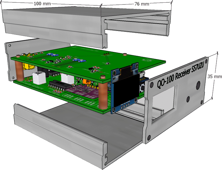Eloksirano aluminijasto ohišje notranjih mer 100 x 76 x 35 mm za QO-100 sprejemnik, z režami za vstavljanje dveh ploščic tiskanega vezja zgoraj in spodaj. V eno režo gre  tiskano vezje VHF dela sprejemnika s svojim z Arduinom krmiljenim VFO-jem, v drugo pa UHF konverterjeva tiskanina.