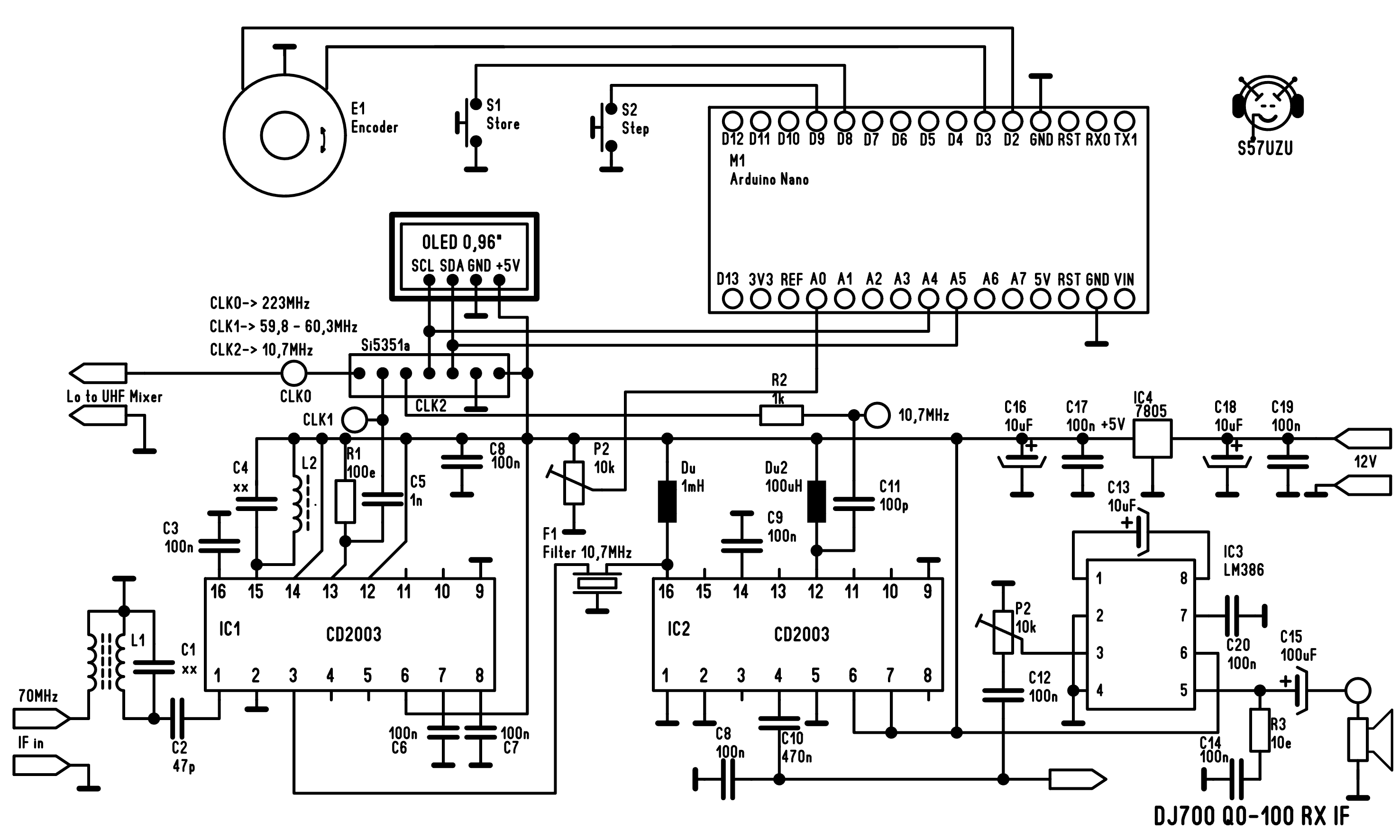 Ta del sprejemnika lahko uporabimo kot samostojen sprejemnik za VHF območje ali pa zgornje pasove kratkovalovnega področja. Ker lahko integrirano vezje CD2003 dela samo v AM ali FM načinu, sta tukaj uporabljena dva kosa (cena je nekaj deset centov ). IC1 (glej podatkovni list) je v FM načinu sprejemnika in meša vhodni signal s signalom iz CLK1 oscilatorja Si5351a. Od tu gre signal preko 10,7MHz keramičnega filtra na IC2, ki dela v AM načinu kot direktni sprejemnik s signalom iz CLK2. Od tu gre signal naprej na NF ojačevalnik in nato na zvočnik ali slušalke. Na VFO oscilatorju nam še ostane izhod CLK0, s katerim generiramo signal 223MHz za UHF tuner.