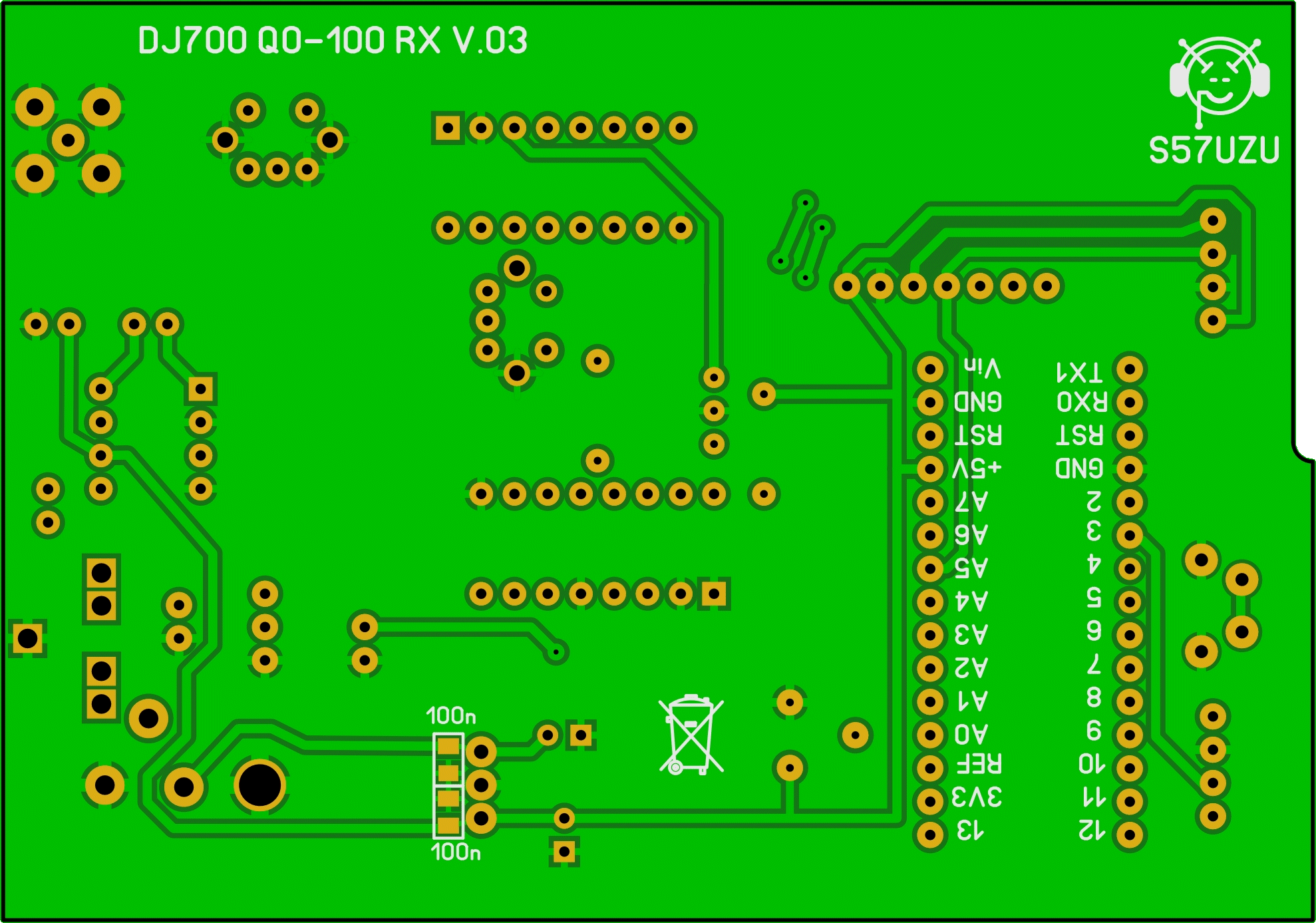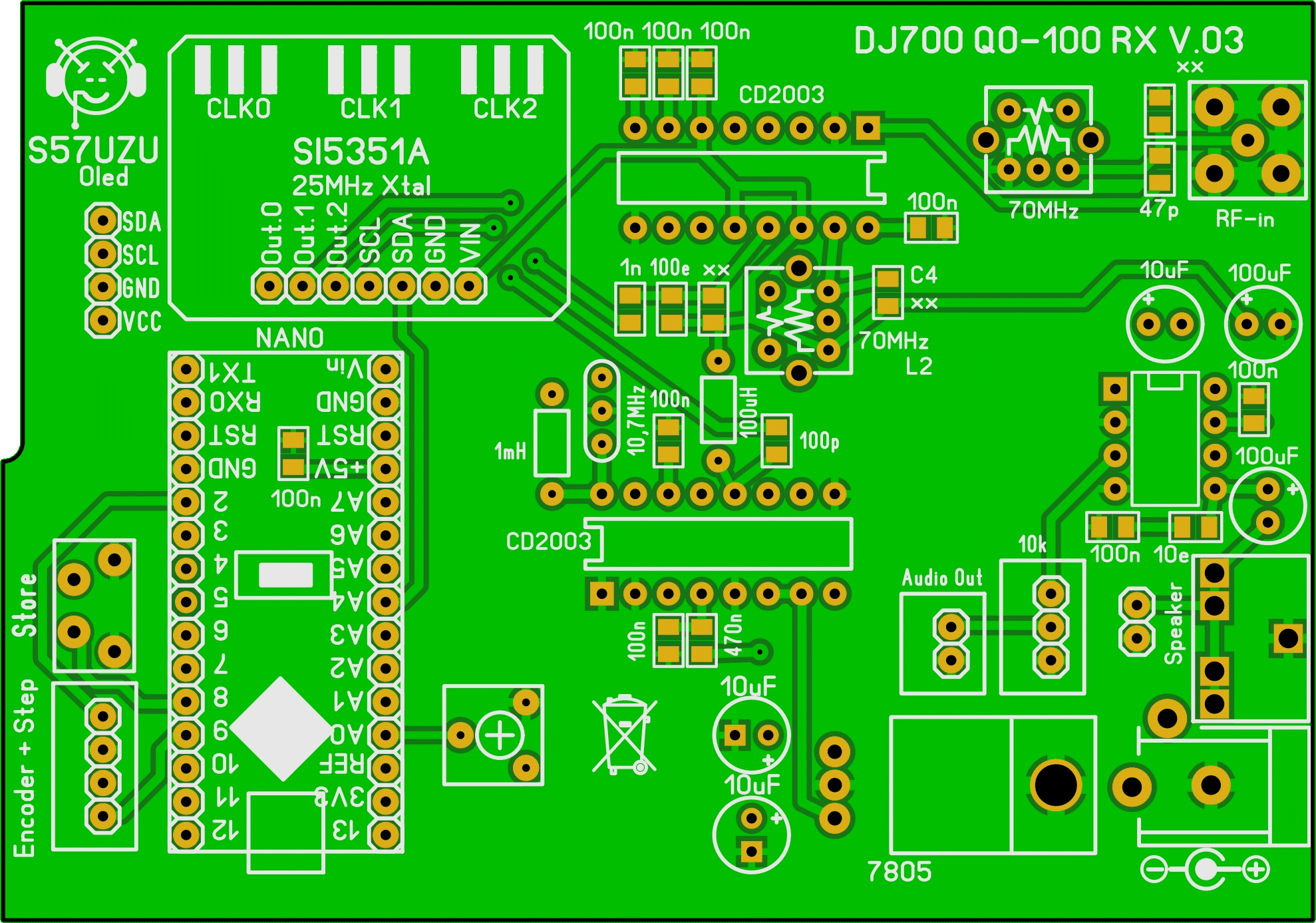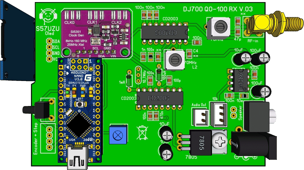 Pred časom sem naredil FT8 transciever. Narejen je bil po avtorju Burkhard Kainka (DK7JD) ki opisuje ideje za samogradnjo preprostega QRP transceiverja za digitalne načine delovanja, kot je n.pr. FT8. Še posebej je zanimiv sprejemni del, ki ga je  enostavno sestaviti s samo integriranim vezjem CD2003 in nekaj zunanjimi elementi. Idejo za QO-100 sprejemnik sem našel na spletni strani nemškega radioamaterja DJ7OO. On opisuje gradnjo direktnega sprejemnika z dvema CD2003 za višja KV in spodnja VHF radioamaterska področja. Takšnemu sprejemniku je potrebno samo še dodati konverter za signal, ki prihaja iz LNB in dodati še 223MHz signal (CLK0) v oscilator Si5351. Obe tiskanini se da vgraditi v aluminijasto ohišje velikosti 100 X 70 X 36mm.