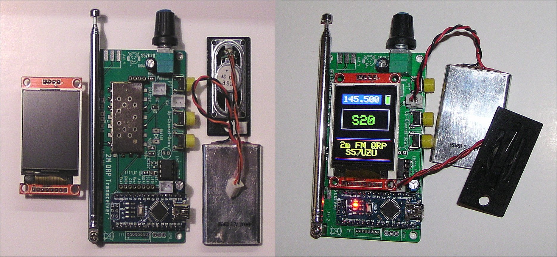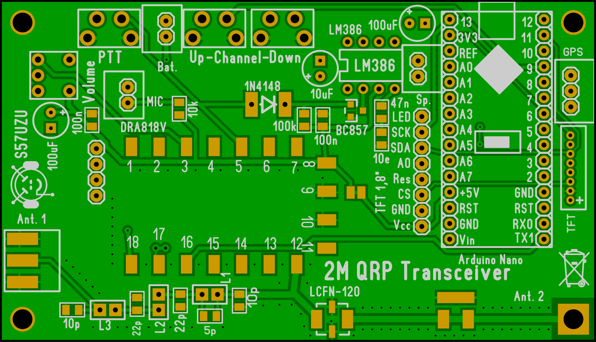 Na tiskanini sem predvidel priključke za klasičen izhodni filter, kakor tudi za keramični nizko prepustni filter LCFN-120 firme Mini-Circuits, SMA konektor za anteno, priključek (nosilec) za teleskopsko 1/4 valno anteno, osem polni konektor za kakšen drugačen prikazovalnik od mojega in konektor za GPS modul za uporabo v APRS namen. Uporabil sem 1,8 colski TFT prikazovalnik in Arduino nano za programiranje DRA808V modula in ostalega, kar je potrebno za vse opcije. Postajo sem sprogramiral na 2m HAM območje in VHF Marine band, saj preživim skoraj celo poletje na morju in sta par takšnih postajic idealna za medsebojno komunikacijo, povezavo z marino in drugimi navtiki.