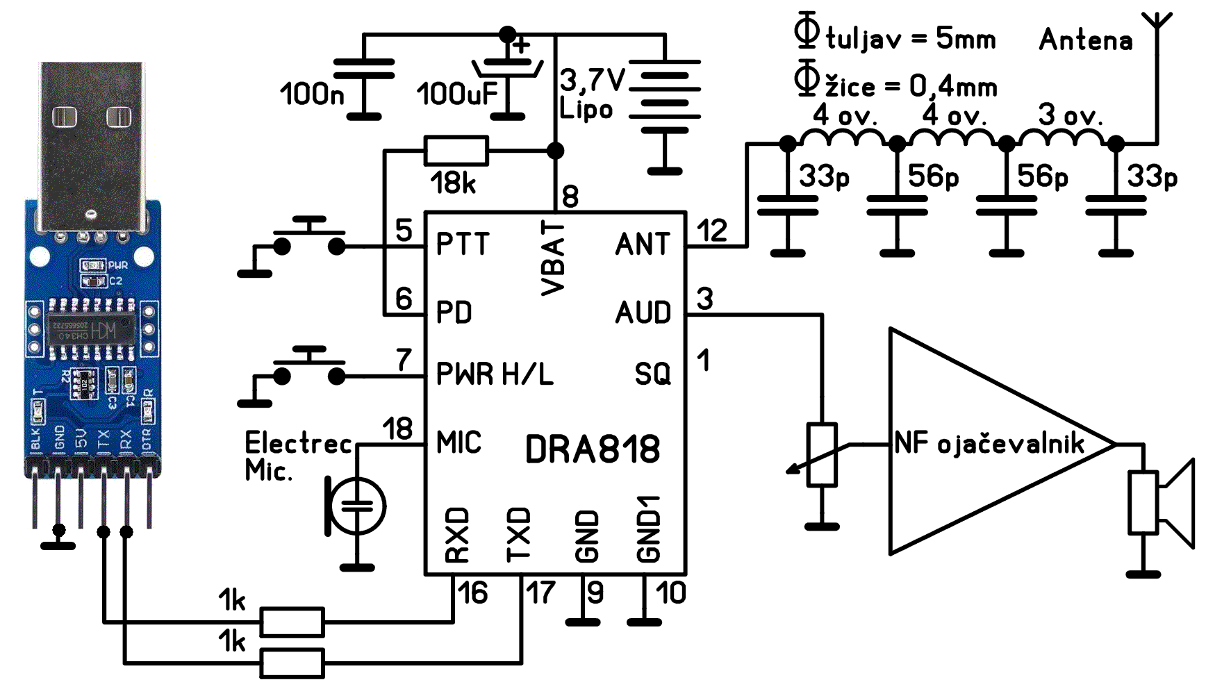 | Kakor je že Jure v svojem članku v reviji Svet elektronike napisal, DRA818 modul vsebuje celoten sprejemnik in oddajnik na VHF frekvencah od 134~174MHz z vsem kar je potrebno za delovanje. Svetujem čitanje celega članka iz revije, saj so tam lepo opisane karakteristike in možnosti tega modula. Za preizkus delevanja modula torej ne potrebujemo drugega kot USB na TTL pretvornik za komunikacijo z modulovim mikrokrmilnikom, napajanje, mikrofon, dve tipki, nizko prepustni filter, anteno in kakšen nizko frekvenčni ojačevalnik z zvočnikom. Če priključimo VF izhod na kakšno dobro umetno breme lahko pri eksperimentiranju izpustimo nizko prepustni filter in anteno. Shema vsega kar sem priključil nanj je na desni sliki. Sprva sem delal čisto brez vsakega zunanjega mikrokrmilnika in prikazovalnika, toliko da preizkusim ukaze iz podatkovnega lista. V podatkovno linijo sem dodal 1kOhm upora, saj moj USB/TTL pretvornik komunicira na 5V nivoju. To sem storil zato, ker nisem nikjer našel podatka ali modul prenese 5V nivo TTL ukazov. Zato tudi pri eksperimentiranju modul napajam ločeno od računalnika z Lipo baterijo, da se nebi slučajno skadilo. Kasneje v vezju z Arduinom tega problema ni, saj se modul in procesor napajata iz istega vira. | ![]() |