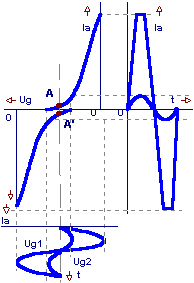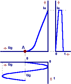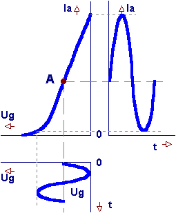 Sestavljena krivulja Ia / Ua za obe elektronki v protitaktni izhodni stopnji v klasi B izgleda tako. Pri veliki amplitudi vhodnega izmeničnega signala Ug1 so popačenja anodnega izmeničnega toka Ia1 razmeroma majhna, pri mali amplitudi Ug2 pa so popačenja zaradi ukrivljenosti karakteristične linije elektronk dosti večja. Izkoristek takšnega protitaktnega ojačevalnika v klasi B je dosti večji od izkoristka protitaktnega ojačevalnika v klasi A. Protitaktno izhodno stopnjo v moramo pravilno izkrmiliti, drugače nastopijo velika popačenja zaradi ukrivljenosti spodnjega dela delovne krivulje elektronk. |